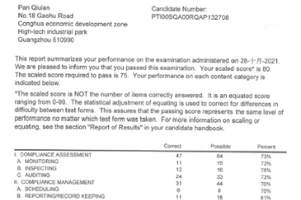2021年10月28日,我司質量保證人員潘秋蘭參加SQA(Society of Quality Assurance)組織的RQAP-GLP(Registered Quality Assurance Professionals in Good Laboratory Practice )考試并一次性通過。 SQA(美國...