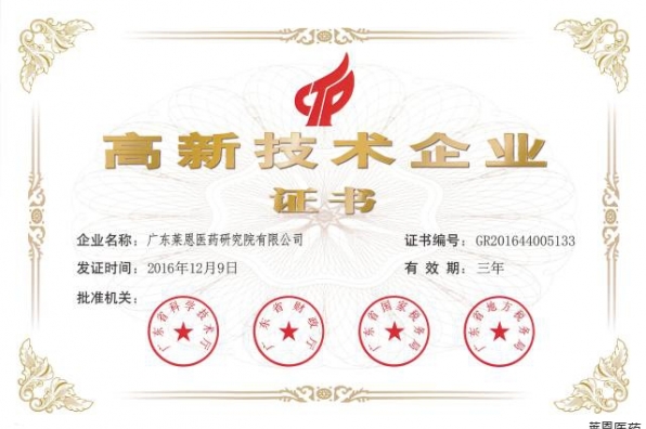 日前,萊恩醫藥獲得由廣東省科學技術廳、廣東省財政廳、廣東省國家稅務局、廣東省地方稅務局聯合頒發的《高新技術企業證書》,正式邁入國家高新技術企業行列。