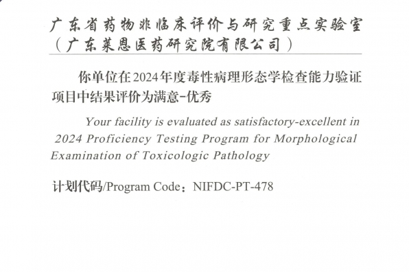 日前,由中國食品藥品檢定研究院組織的“2024年度毒性病理形態學檢查能力驗證”項目正式公布結果,萊恩醫藥憑借動物醫學檢驗檢測研究平臺優勢,順利通過本次能力驗證,并獲得優秀證書。