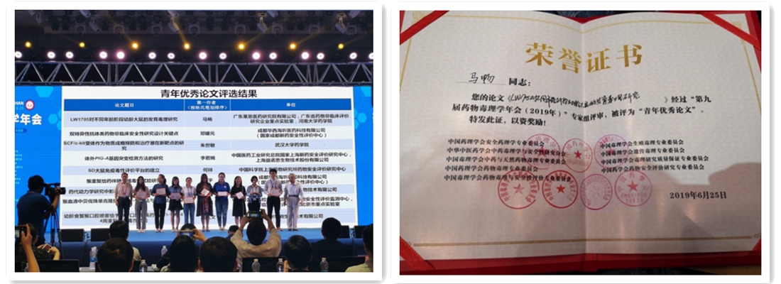 2019年06月22日-25日,第九屆藥物毒理學年會在武漢成功召開,萊恩醫(yī)藥組織各部門的優(yōu)秀科研工作者參與本次大會。大會期間還舉行了“安全藥理青年優(yōu)秀論文暨國際學術(shù)交流獎”和“青年優(yōu)秀論文獎”的評選,萊恩醫(yī)藥副總經(jīng)理郭健敏博士全程以流利的英文進行匯報并對專家提出的問題給出了精彩而全面的回答,最終以評分第1名的成績斬獲“國際學術(shù)交流獎”,獲中國藥理學會安全藥理學專業(yè)委員會全額贊助參加2019年國際安全藥理學年會;我院研究生馬暢獲評“青年優(yōu)秀論文獎”;同時我院專題負責人雷夏凌、黃遠鏗、盛亞麗分別受邀參加分會場報告。