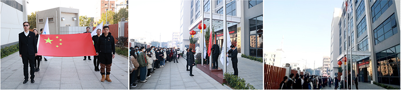 在莊嚴而又隆重的升旗儀式中,護旗手護衛著國旗,邁著堅定的步伐走向升旗臺。伴隨著雄壯的國歌聲,鮮艷的五星紅旗冉冉升起、迎風飄揚。全體人員精神飽滿、肅然而立,莊重地行注目禮,向著莊嚴的國旗表達著最崇高的敬意。