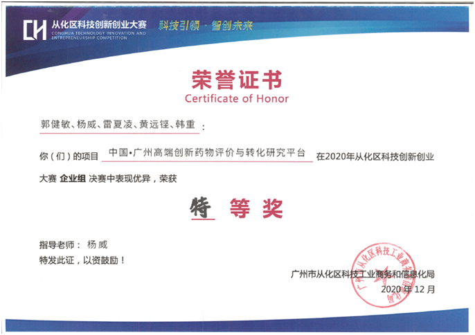 ? 2020年12月08日,從化區(qū)科技創(chuàng)新創(chuàng)業(yè)大賽決賽在廣州城建職業(yè)學(xué)院圓滿結(jié)束,經(jīng)歷層層評(píng)選,萊恩醫(yī)藥最終取得了從化區(qū)科技創(chuàng)新創(chuàng)業(yè)大賽特等獎(jiǎng),從化區(qū)科工商信局黃康華副局長(zhǎng)、廣州城建職業(yè)學(xué)院王媚莎副校長(zhǎng)等領(lǐng)導(dǎo)出席大賽,并為獲獎(jiǎng)團(tuán)隊(duì)頒發(fā)榮譽(yù)證書。