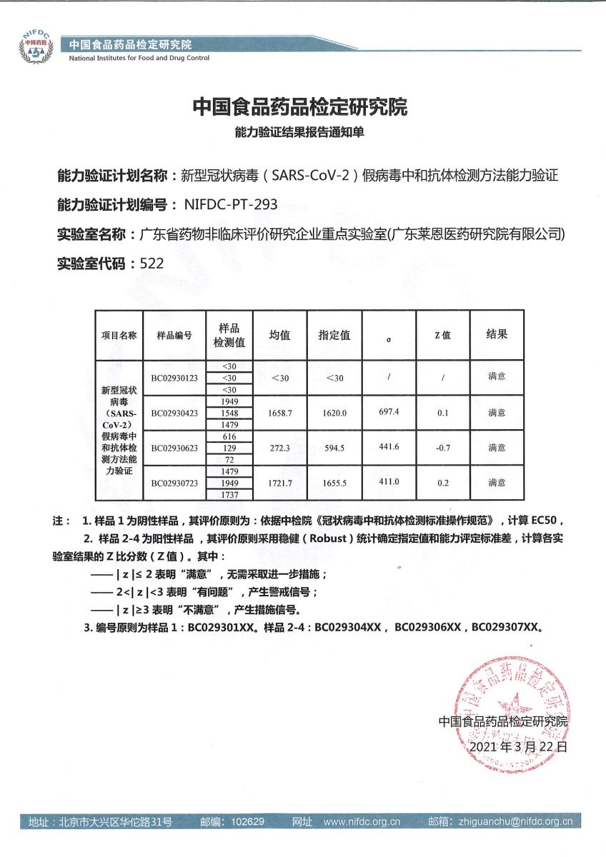 日前,國家食品藥品檢定研究院公布了能力驗證計劃——新型冠狀病毒(SARS-CoV-2)假病毒中和抗體檢測方法能力驗證結果,廣東省藥物非臨床評價研究企業重點實驗室(廣東萊恩醫藥研究院有限公司)的四項結果全部獲得滿意認可!
