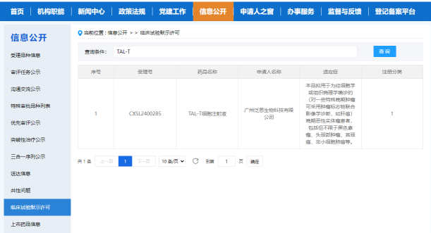2024年7月23日,據國家藥品監督管理局藥品審評中心(CDE)官網顯示,廣州泛恩生物科技有限公司(以下簡稱“泛恩生物”)申請的“TAL-T細胞注射液”已獲得臨床試驗默示許可,該產品注冊分類為生物藥1類,用于晚期惡性實體瘤患者的治療。