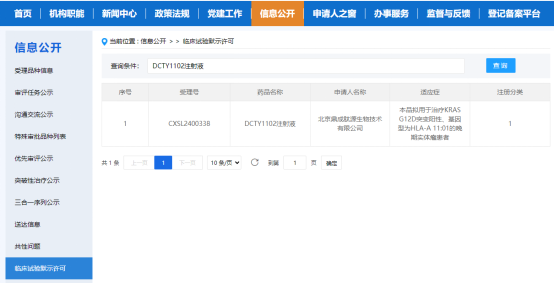 2024年8月8日,據國家藥品監督管理局藥品審評中心(CDE)官網顯示,北京鼎成肽源生物技術有限公司(以下簡稱“鼎成肽源”)申請的“DCTY1102注射液”已獲得臨床試驗默示許可,該產品注冊分類為生物藥1類,用于晚期胰腺癌、結直腸癌等惡性實體腫瘤患者的治療。