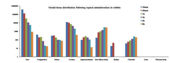 LW1920滴眼液擬開發為治療眼前段疾病的創新藥眼科制劑,青紫藍兔單次滴眼給藥后,在給藥后10min、30min、1h、2h、4h、8h采集眼部組織(淚液、角膜、結膜、房水、虹膜-睫狀體、晶狀體、玻璃體、視網膜、脈絡膜、鞏膜)。藥物的平均組織濃度見圖9,結果顯示藥物在眼前段組織的分布量較高,眼后段的分布量較少,藥物在虹膜-睫狀體和脈絡膜的分布量較高,與藥物與黑色素高親和力有關。
