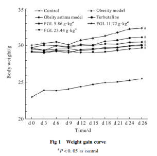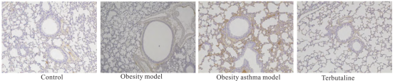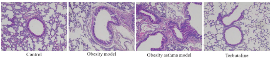 (1)分組:在動物適應性觀察結束之后,隨機挑選8只為陰性對照組(Control),正常維持飼料喂養;其他動物高脂飼料喂養。六周后分組,選取體重大于陰性對照組平均體重約20%的動物建立肥胖哮喘模型,分為肥胖組(Obesity model)、肥胖哮喘模型組(Obesity asthma model)、硫酸特布他林(Terbutaline)組。
