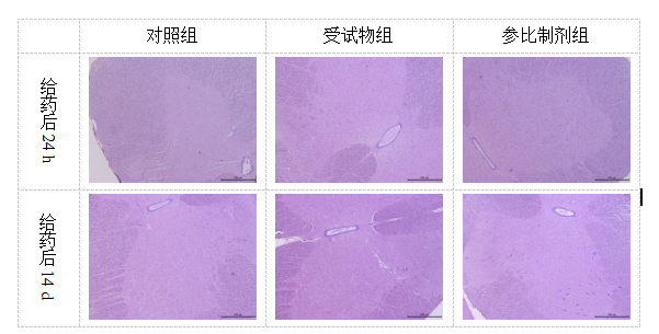 實驗結果:對照組、受試物、參比制劑組動物注射部位及周圍的腰椎和脊髓均未見異常。
