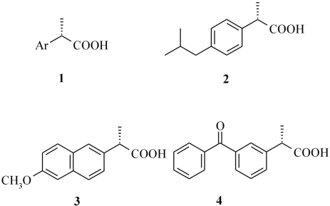 圖5 2-芳基丙酸類藥物(NSAID)結構,2-芳基丙酸(1)、萘普生(2)、布洛芬(3)、酮洛芬(4)