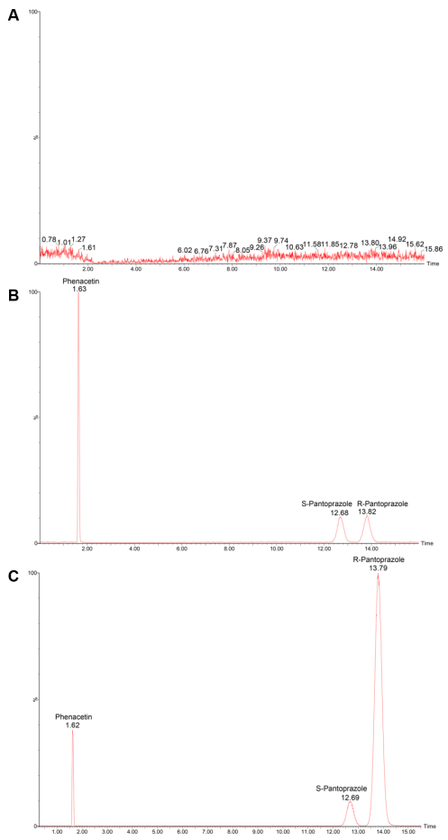 圖8 大鼠血漿中S-和R-PTRS和非那西丁(內標)的代表性色譜圖:(A)空白血漿樣品;(B)空白血漿基質中LLOQ水平(10 ng/mL)下的S-和R-PTRS(IS,10 μg/mL);(C)單次口服R-PTRS(200mg/kg)后0.25小時采集的血漿樣本。