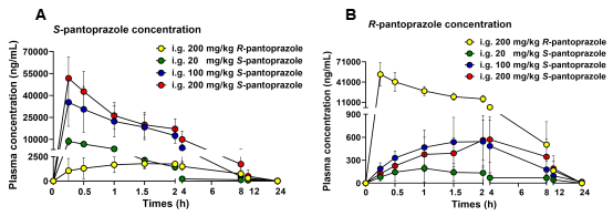 SD大鼠灌胃給藥后,于藥前(0h)和給藥后15min、0.5h、1h、1.5h、2h、4h、8h、12h、24h采集血樣。通過建立的UPCC-MS/MS檢測方法測定血漿中S-和R-PTR的藥物濃度,大鼠血漿中S-和R-PTR的代表性色譜圖如圖5所示。藥物的平均血藥濃度-時間曲線圖見圖6,結果提示,口服給予200mg/kg的S-PTR后,可在24h內檢測到S-PTR和少量的R-PTR。并且,口服200mg/kg的R-PTR后也可在24h內觀察到類似的情況。這一結果表明,大鼠血漿中S-和R-PTR存在雙向手性反轉。根據AUC