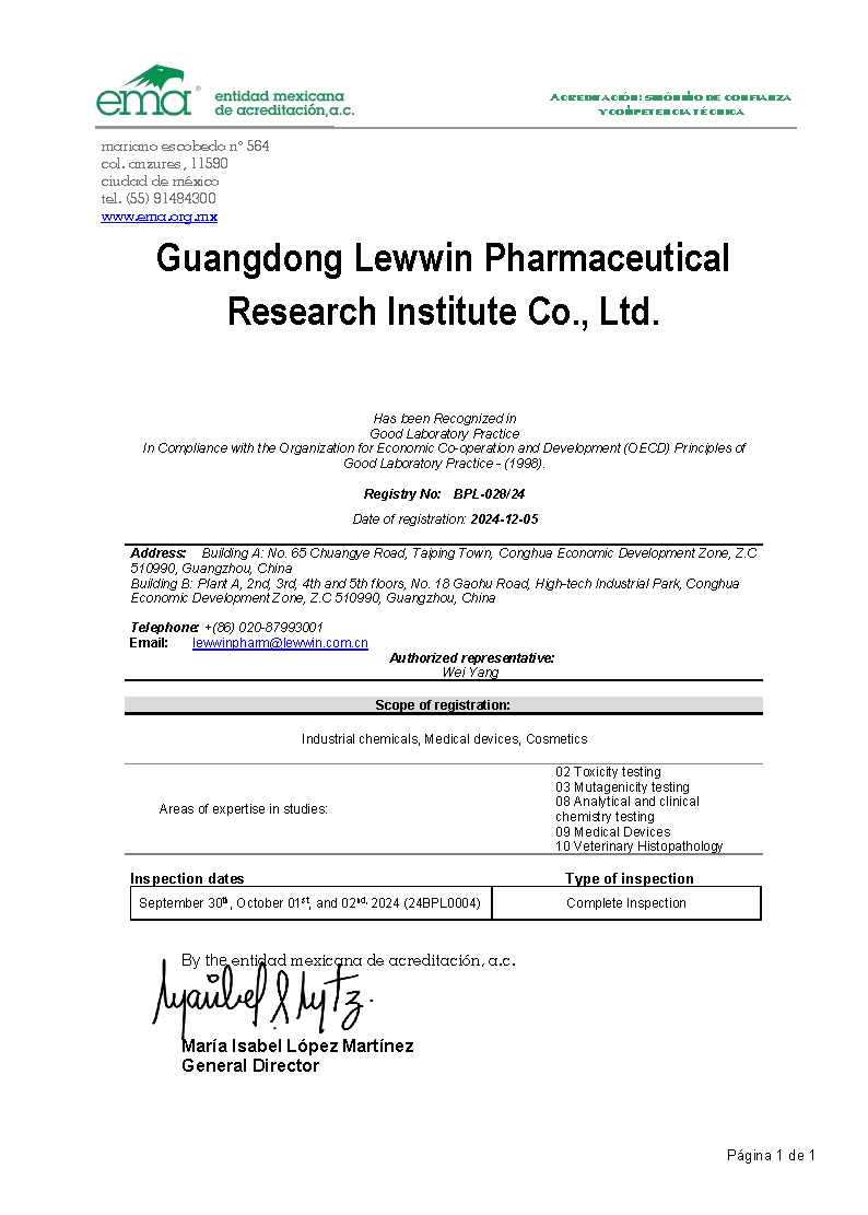 萊恩醫藥于2024年12月05日獲得了經濟合作與發展組織(Organization for Economic Co-operation and Development, OECD)GLP認證證書,本次OECD GLP認證領域包括: