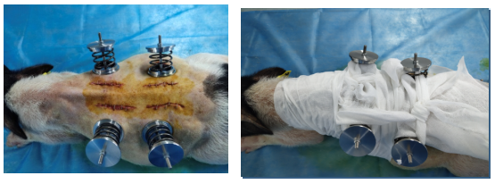壓力潰瘍創面造模:動物麻醉后取俯臥位固定于手術臺上;動物背部備皮作常規無菌消毒,于背部兩側作與身體長軸平行長約50mm深達肌層的皮膚切口,鈍性分離皮膚和肌層,植入自制的壓瘡裝置,置入鋼板,在皮膚表面以螺釘為中心自下而上分別安置另一鋼板、彈簧、第三鋼板并固定,調節加力螺母產生10kg的壓力,縫合皮膚切口。持續加壓24h后拆除裝置,造成Ⅱ期褥瘡程度的壓力潰瘍創面。