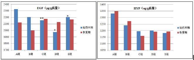 給藥頻率及劑量:首次造模第2天開始經皮給藥,給藥面積約占體表面積的10%。連續給藥12周,C、D組每天給藥1次,E組每天給藥2次(每次給藥間隔約6小時),每次給藥后于下一次給藥時除藥;A、B組動物不給藥,僅每天拆開包扎對背部皮膚(或燒傷部位)消毒及觀察。連續給藥12周。