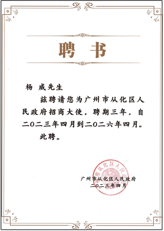 近日,2023年第九屆中國廣州國際投資年會從化分論壇以“綠色崛起智造從化”為主題,在廣州白云國際會堂正式舉辦。本次分論壇,從化重磅推出“1+3+5+N”產業政策體系,同時向25位杰出招商代表頒發了“從化區招商大使”證書,萊恩醫藥董事長楊威榮獲從化區首批“招商大使”。