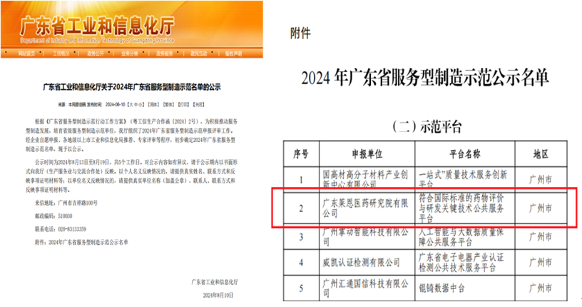 (4)萊恩醫藥“符合國際標準的藥物評價與研發關鍵技術公共服務平臺”成功入選廣東省服務型制造示范平臺。