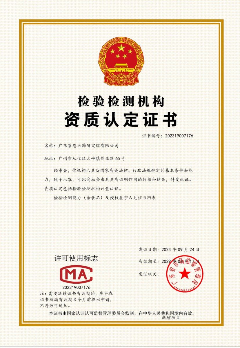 (3)萊恩醫藥順利通過CMA資質認定擴項申請,新獲化妝品、保健食品和疾病預防控制領域新增檢測參數66個,總認證參數達到161個。