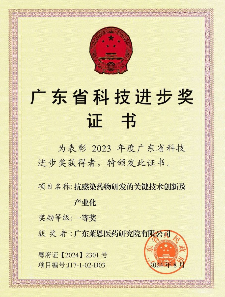• 萊恩醫藥聯合申報項目《抗感染藥物研發的關鍵技術創新及產業化》榮獲廣東省科技進步一等獎,持續推動抗感染藥物技術創新與應用。