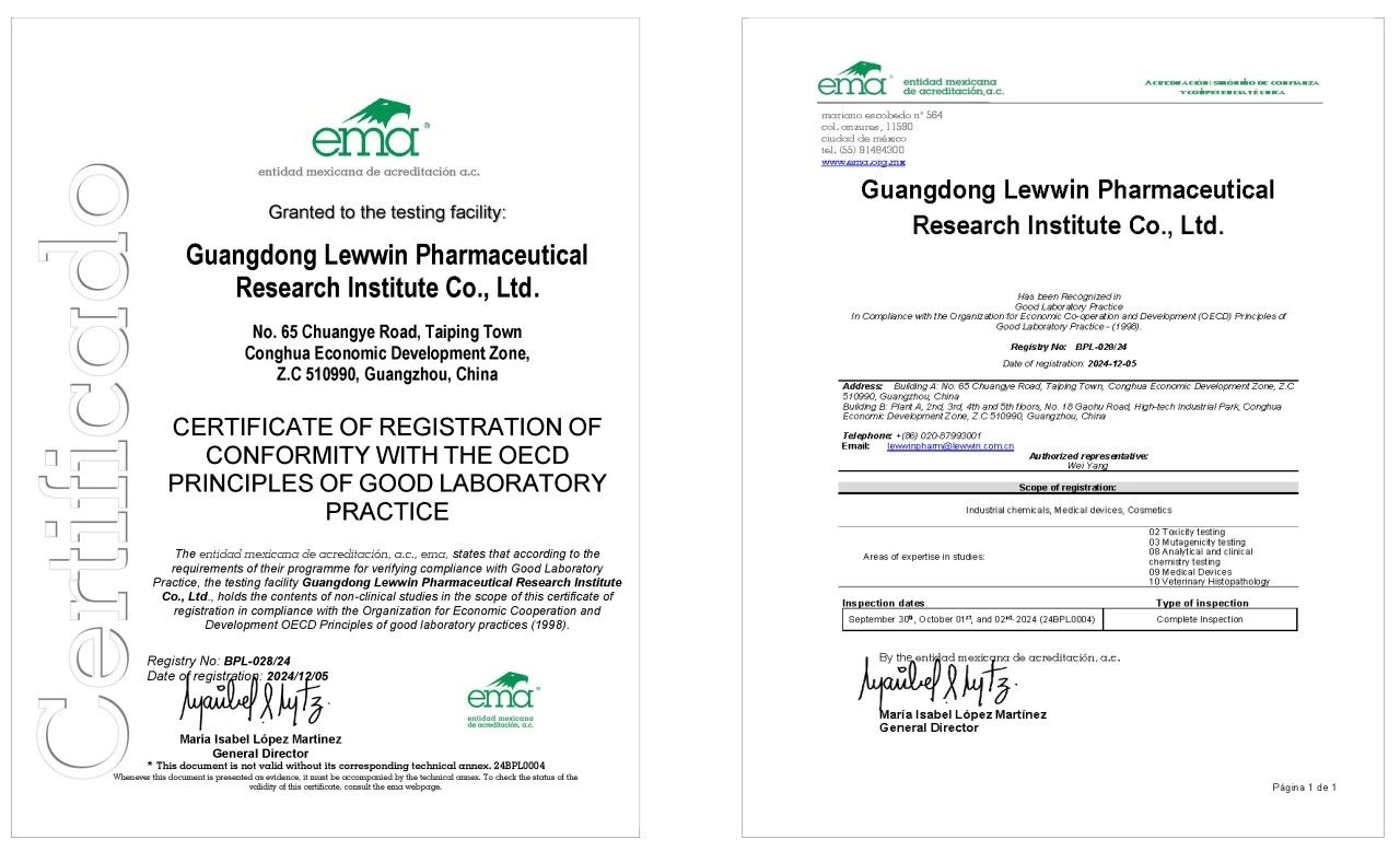 (1)萊恩醫藥獲得經濟合作與發展組織(Organization for Economic Co-operation and Development, OECD)GLP認證,在毒性試驗研究(單次給藥毒性試驗、多次給藥毒性試驗、安全性藥理試驗、局部毒性試驗、免疫原性試驗、生殖毒性試驗、致癌試驗、毒代動力學試驗、依賴性試驗)、致突變研究、分析化學和臨床化學測試、醫療器械生物學評價、獸醫組織病理學領域通過認證。