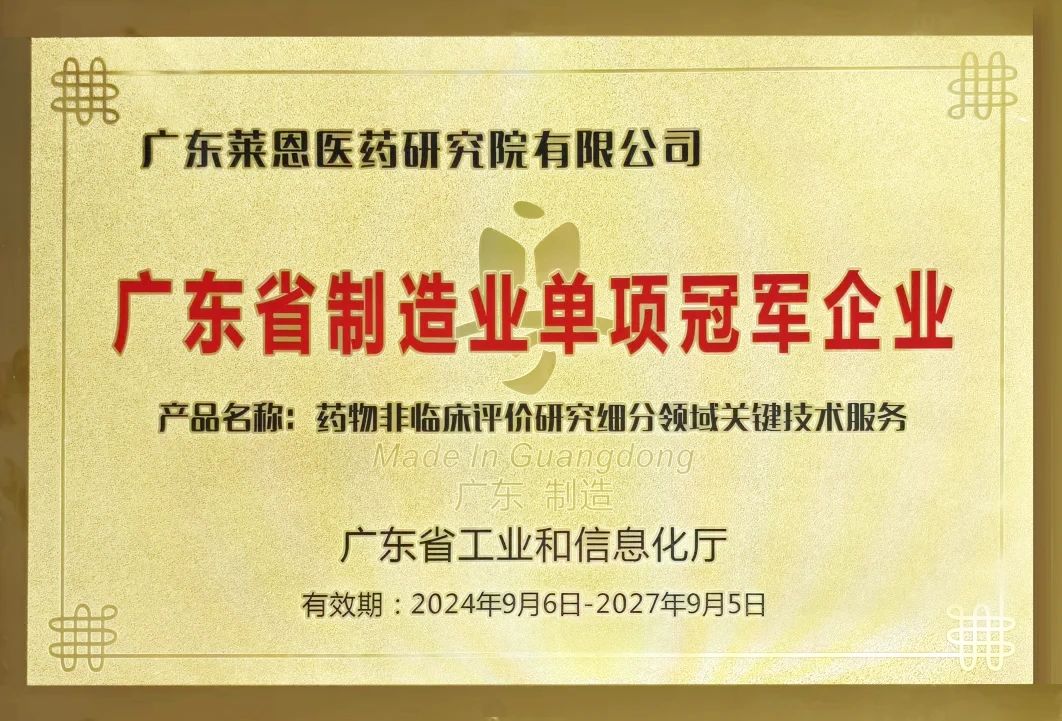 (3)萊恩醫藥獲批“2024年廣東省省級制造業單項冠軍企業”,引領“藥物非臨床評價研究細分領域關鍵技術”研究與應用!