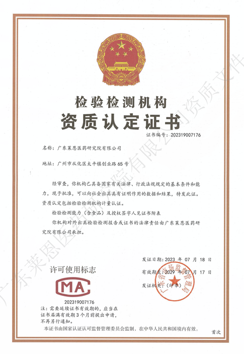 祝賀萊恩醫藥在NMPA、CNCA GLP認證資質的基礎上新獲醫療器械、化妝品、食品及食品相關產品、藥品、消毒產品及消毒效果、化學品六大類別的CMA資質認定