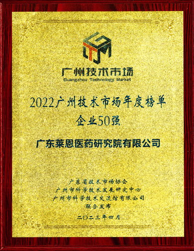 2023年4月,2022廣州技術(shù)市場(chǎng)年度榜單發(fā)布會(huì)上發(fā)布了“2022廣州技術(shù)市場(chǎng)年度榜單”,萊恩醫(yī)藥榮獲“2022廣州技術(shù)市場(chǎng)生物醫(yī)藥領(lǐng)域10強(qiáng)企業(yè)”稱號(hào),并排名第二。