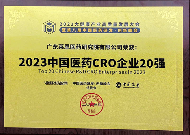 2023年6月,萊恩醫(yī)藥入圍2023中國(guó)醫(yī)藥CRO 企業(yè)排行榜榜單前20強(qiáng)。