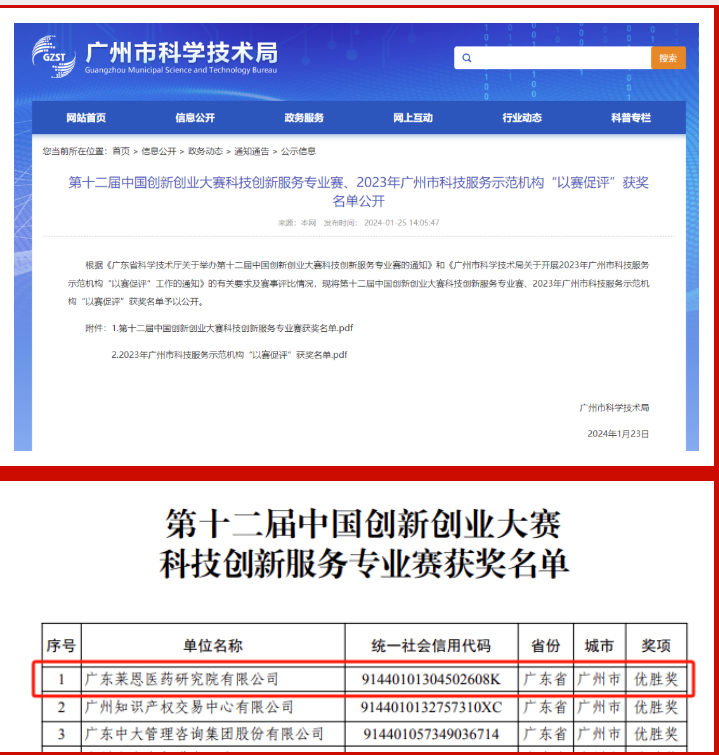 2023年12月,萊恩醫(yī)藥獲第十二屆中國(guó)創(chuàng)新創(chuàng)業(yè)大賽科技創(chuàng)新服務(wù)專業(yè)賽優(yōu)勝獎(jiǎng)第一名。