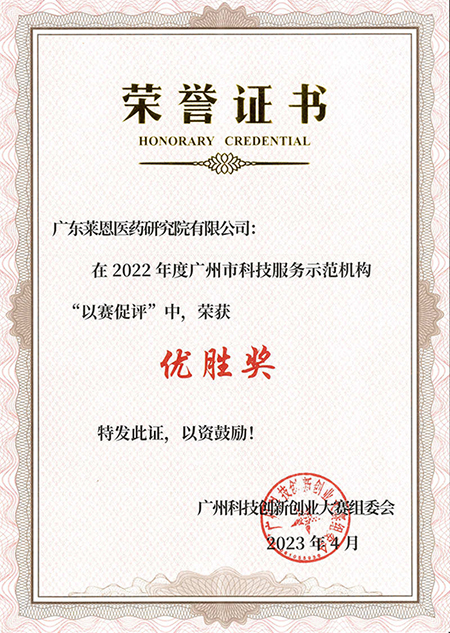 萊恩醫(yī)藥連續(xù)兩年獲得廣州市科技服務(wù)示范機(jī)構(gòu)“以賽促評(píng)” 決賽優(yōu)勝獎(jiǎng)生物醫(yī)藥服務(wù)企業(yè)第一名。