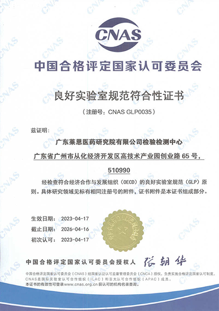2023年4月,萊恩醫(yī)藥獲醫(yī)療器械、化學(xué)品CNAS GLP認(rèn)證證書(shū),是在NMPA藥物GLP全項(xiàng)(10項(xiàng))認(rèn)證資質(zhì)基礎(chǔ)和多年藥物非臨床評(píng)價(jià)研究經(jīng)驗(yàn)的基礎(chǔ)上,在新科研領(lǐng)域取得的又一重大進(jìn)展。