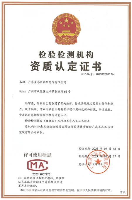 2023年7月,萊恩醫(yī)藥在NMPA、CNCA GLP認(rèn)證資質(zhì)的基礎(chǔ)上新獲醫(yī)療器械、化妝品、食品及食品相關(guān)產(chǎn)品、藥品、消毒產(chǎn)品及消毒效果、化學(xué)品六大類別的CMA資質(zhì)認(rèn)定證書(shū)。
